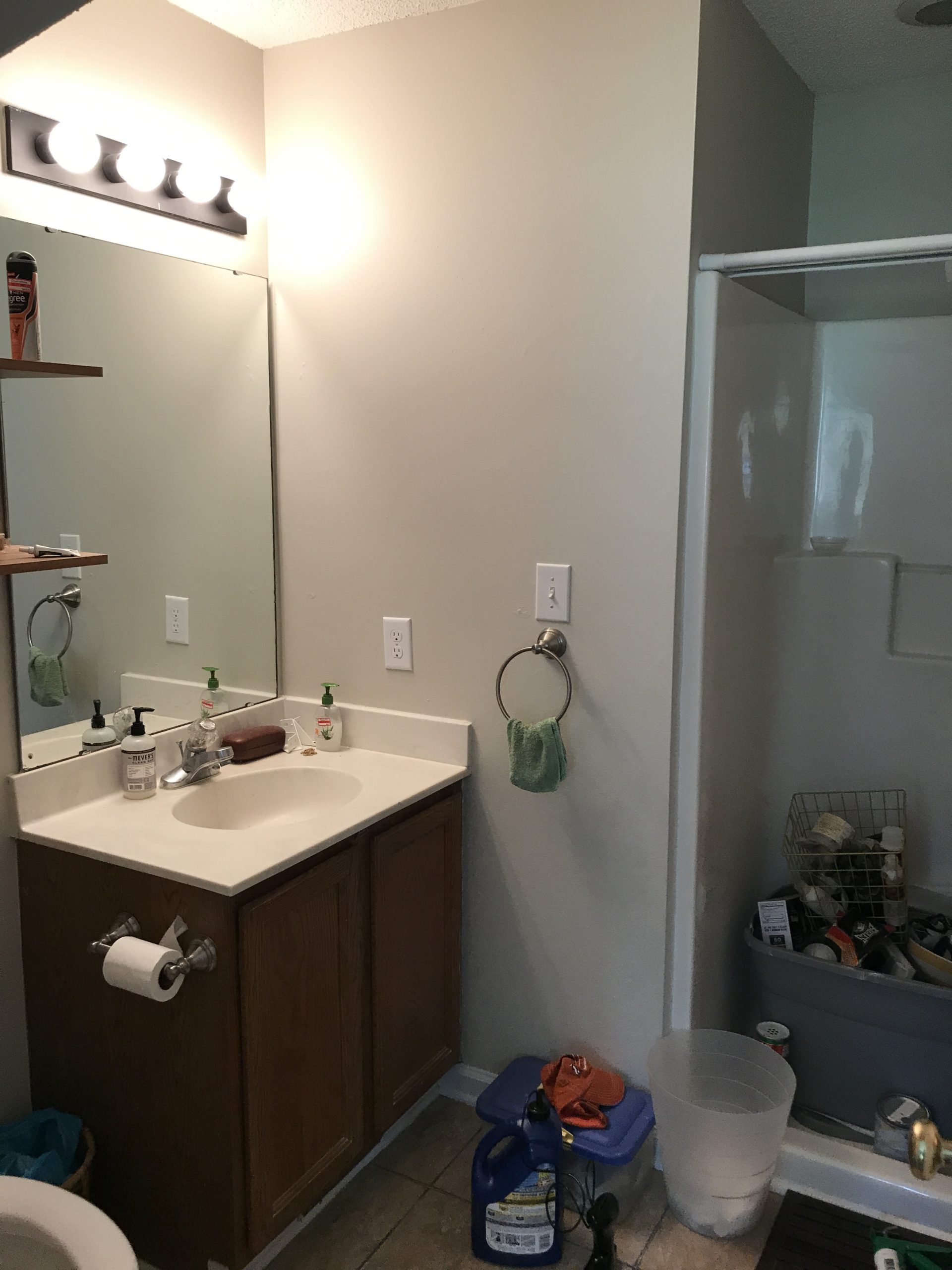 You’re obviously getting the most real before ever because I didn’t even clean up after dropping the stuff into the room. While the bathroom was completely liveable (minus the heinous amounts of unpacking needed) it wasn’t our style. It’s also not very functional as it stands. It has a really teeny and impractical shower which is literally the size of a packing bin. So this room has a bigger reno down the road for it. In the mean time, we gave it a little facelift for right around $125.