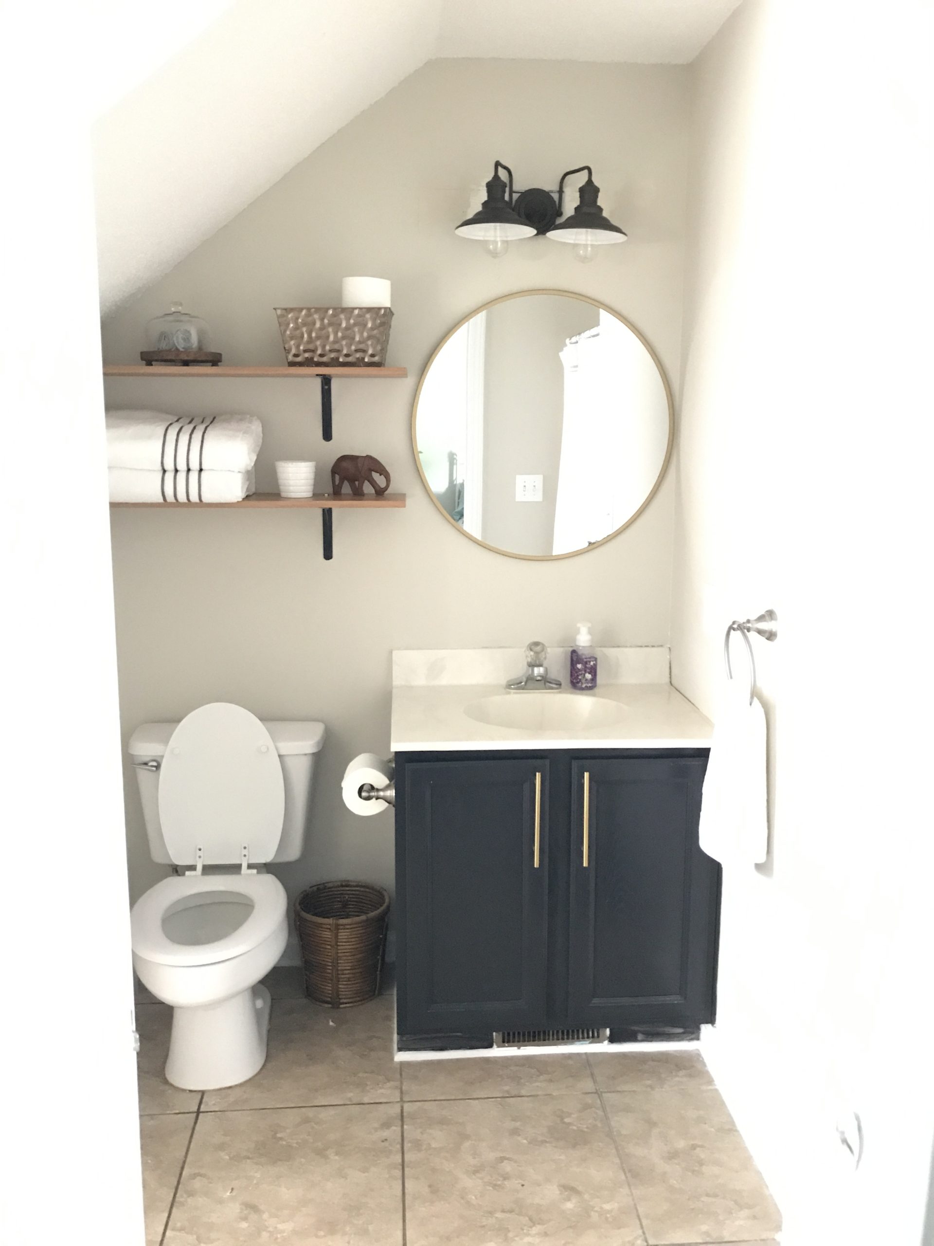 Shelf décor: Free. Again sort of free but they are found items from our old homes décor. The little elephant is 50 cent thrift store find. The brass tin with the toilet paper is actually the container from a cheese basket from our realtor so actually free. The little cheese plate with the wash clothes is a $1 thrift store find and the little pot if a 50 cent find from ikea. I’m still juggling on what to put in that little flower pot that will live in this relatively dark space.